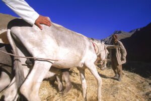Tajik farmers and their families thresh wheat with oxen and donkeys, in a side valley to the Panjshir Valley, in the Hindu Kush mountains, September 10, 2002. Agriculture is primitive and labor intensive in this remote valley. The Panjshir Valley and its